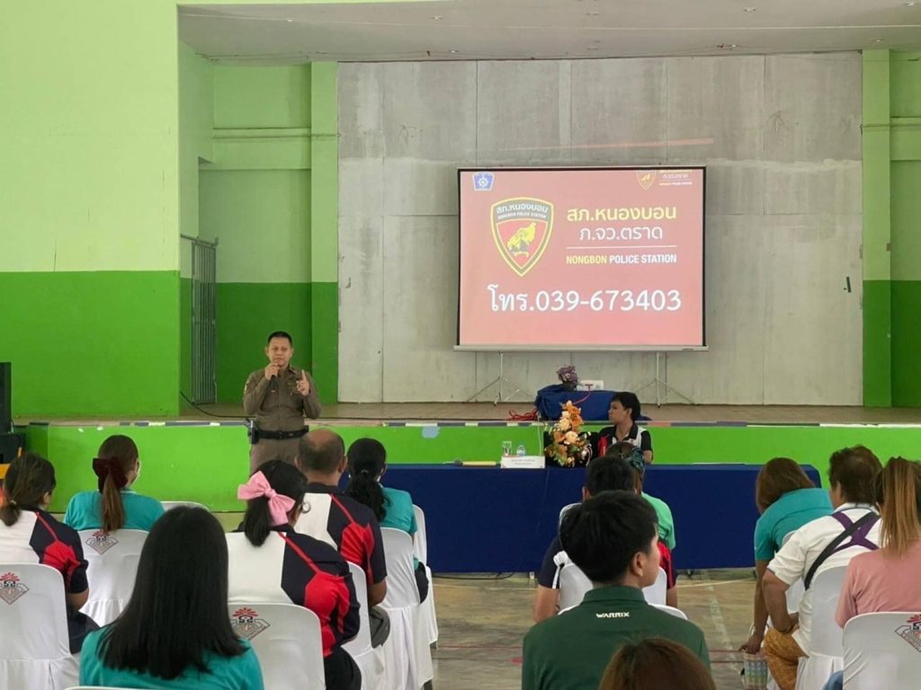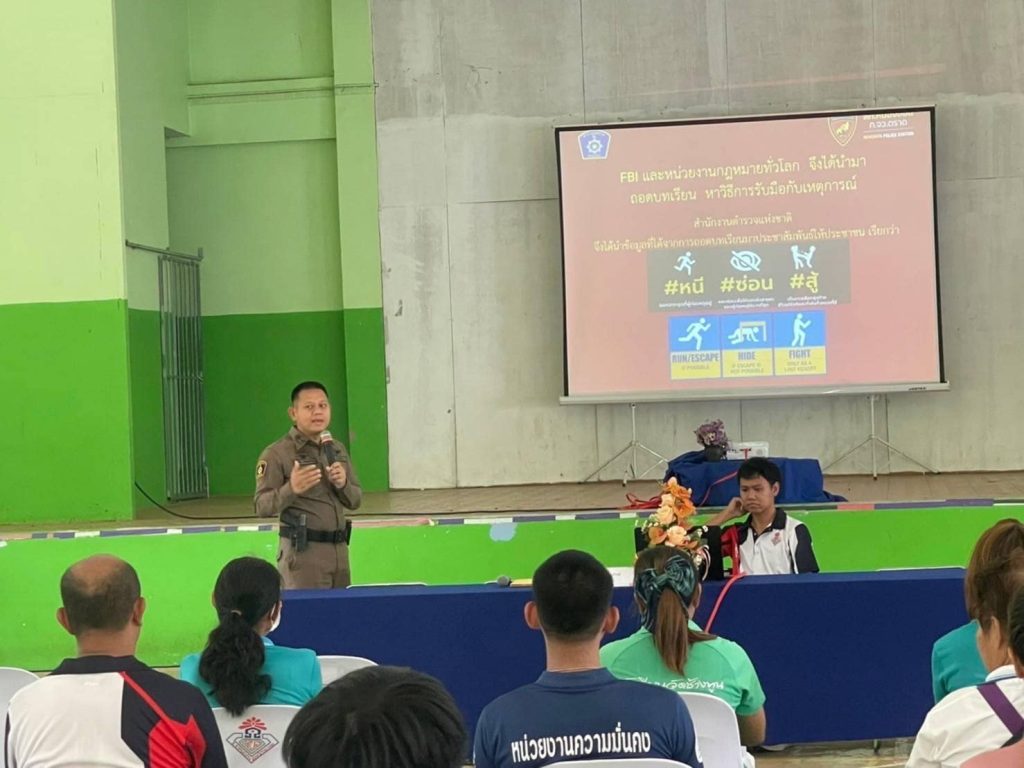 วันที่ 2 กุมภาพันธ์ 2567 เวลา 13.00 น. พ.ต.ท.บัณฑิต เหล่าสุทธิวงษ์ สวญ.สภ.หนองบอน พร้อมเจ้าหน้าที่ตำรวจ สภ.หนองบอน ได้เป็นวิทยากรให้ความรู้เกี่ยวกับการ หนี ซ่อน สู้ แจ้ง กรณีเกิดเหตุการณ์กราดยิง หรือบุคคลคุ้มคลั่ง แก่ครูในพื้นที่ ตำบลหนองบอน และตำบลช้างทูน, เจ้าหน้าที่โรงพยาบาลส่งเสริมสุขภาพตำบลหนองบอน และ ประชาชนในเขตพื้นที่ ณ.หอประชุมโรงเรียนหนองบอนวิทยาคม ต.หนองบอน อ.บ่อไร่ จ.ตราด
